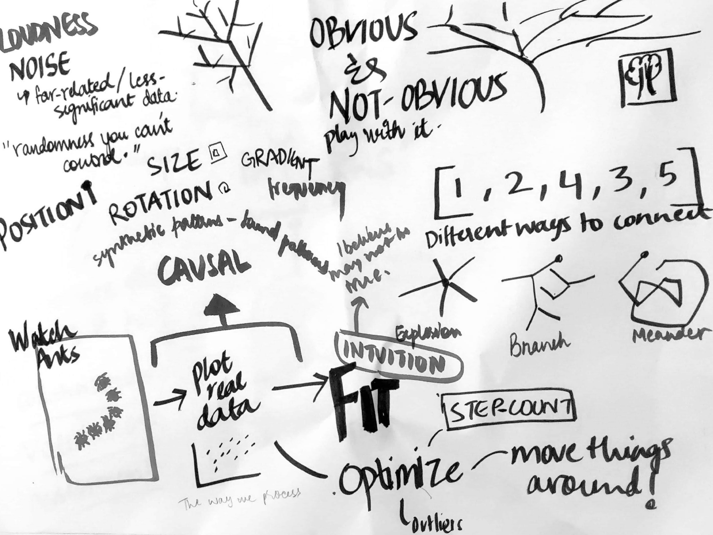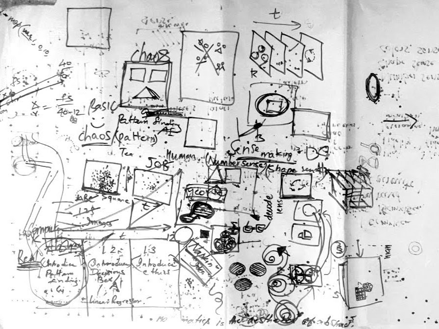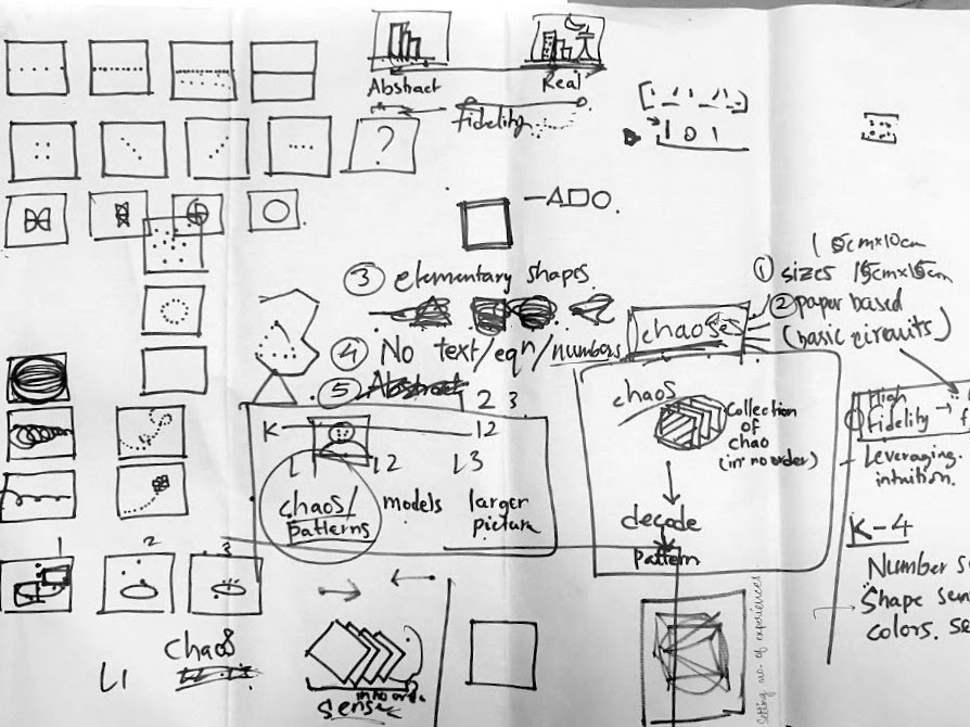 (a) A simple input/output machine process using a paper ball as data and pipes as the network with weight fluctuation and adjustment was explored, (b) The napkin idea - gave way to explore patterns with the lens of order and chaos